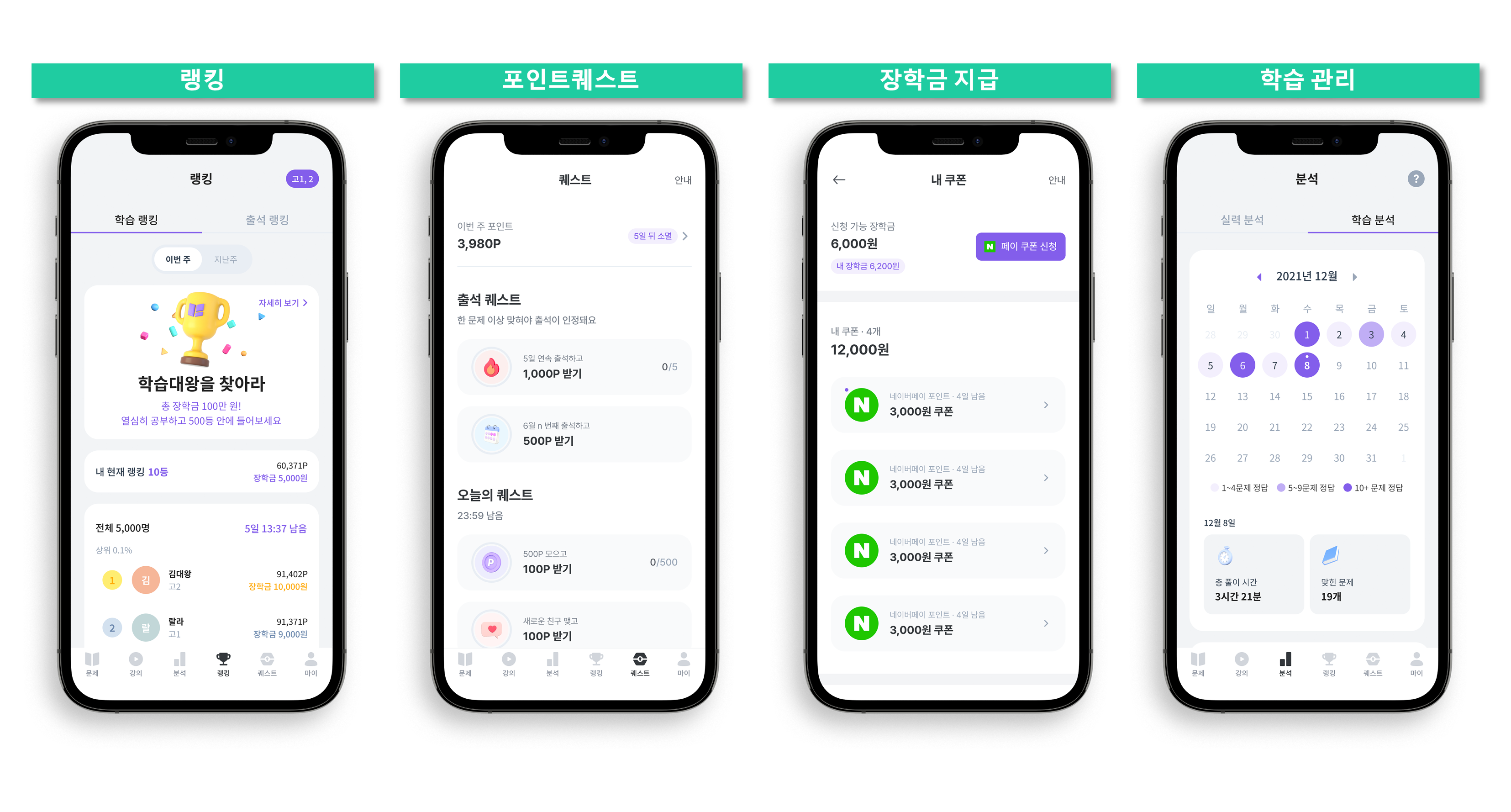 [퀘스트]와 [랭킹]이라는 게임 요소를 더해 학생들이 학습 과정에 꾸준히 몰입할 수 있도록 하고
